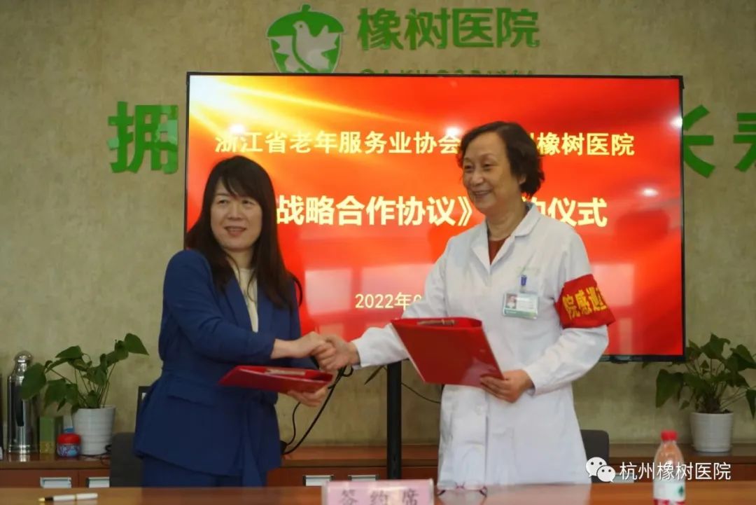 浙江省老年服务协会副会长周微与杭州橡树医院护理院长冯怡签订战略合作协议
